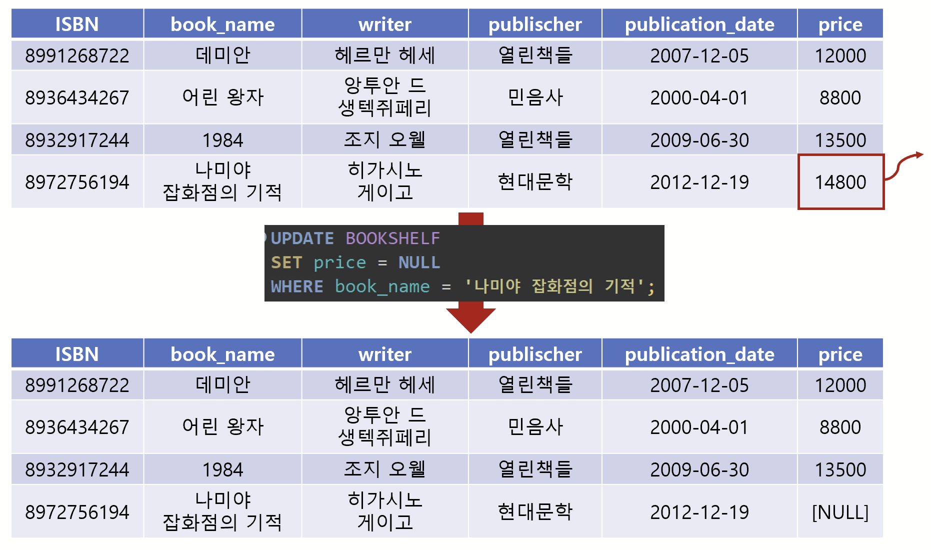 • 그렇다면 행이 아닌 특정 컬럼에 대한 값을 없애고 싶을 때는 어떻게 해야 할까?