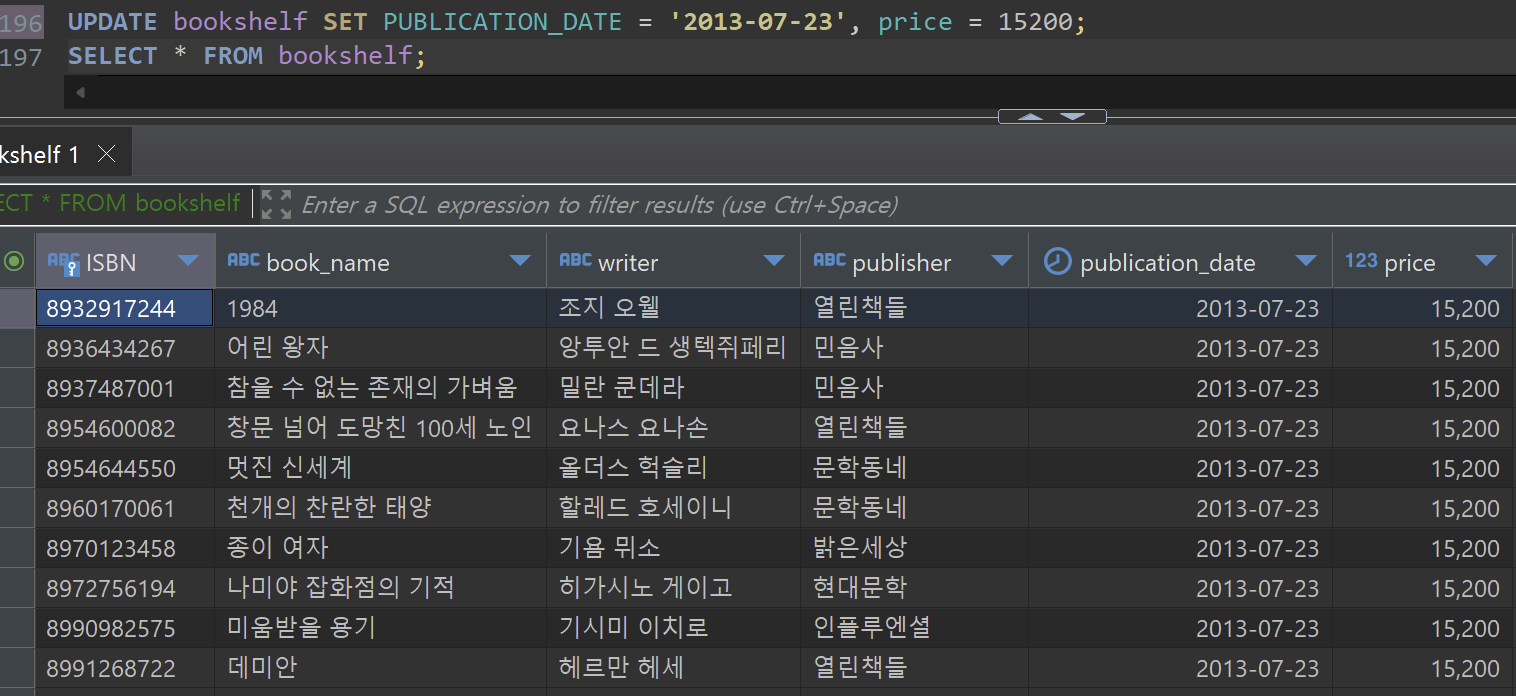 UPDATE bookshelf SET PUBLICATION_DATE = '2013-07-23', price = 15200