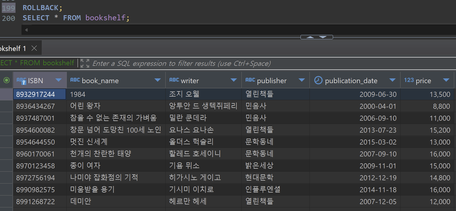 INSERT INTO bookshelf (ISBN, book_name, writer, publisher, publication_date, price)