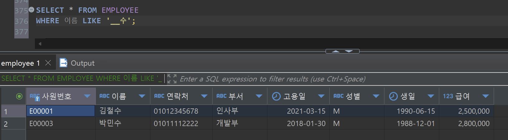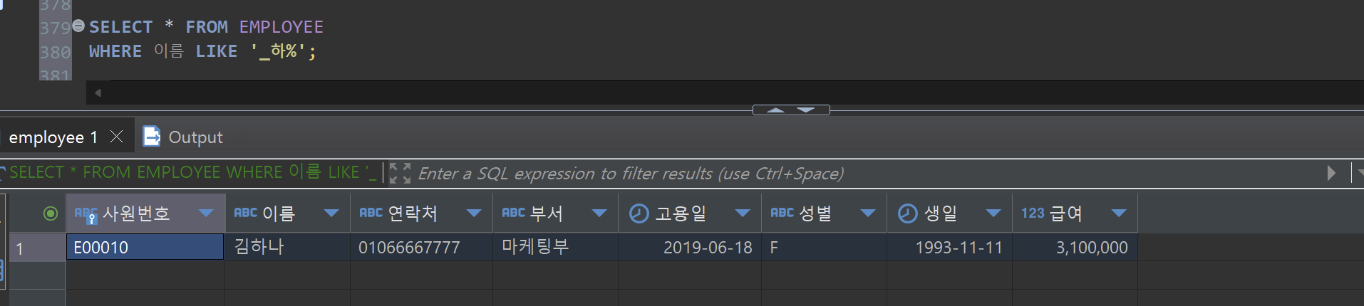 ➯ _ : 딱 1개의 문자만을 대체 = 해당 위치에서 반드시 한 글자만 올 수 있다는 것 - LIKE는 대소문자를 구분하지 않는다.