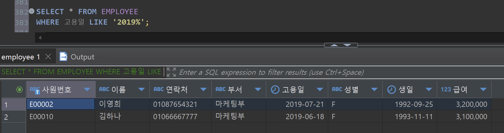 - LIKE는 특정 패턴과 일치하는 데이터를 조회할 때 사용한다.