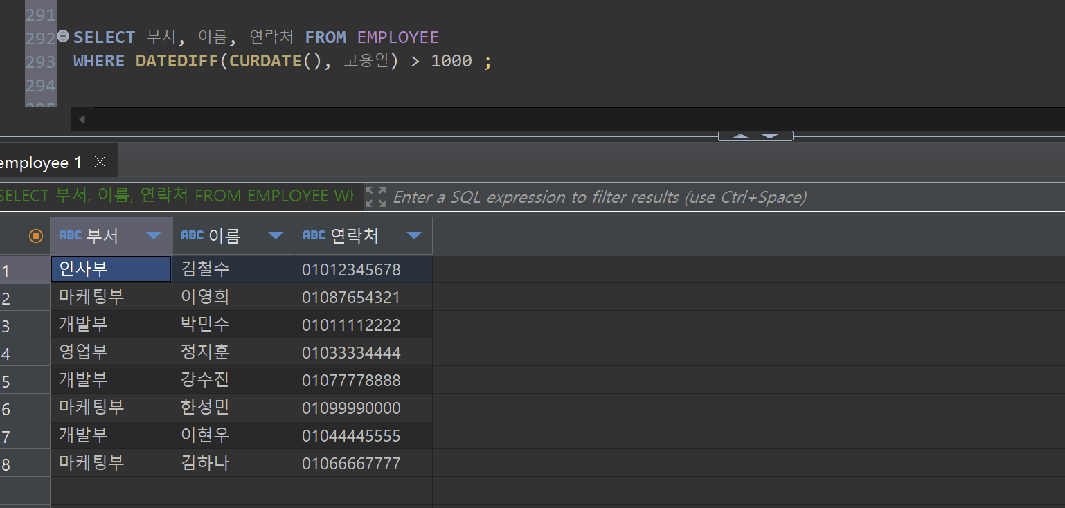 • 참고로 AS로 별칭을 붙인 컬럼은 WHERE절에서 사용할 수 없다.