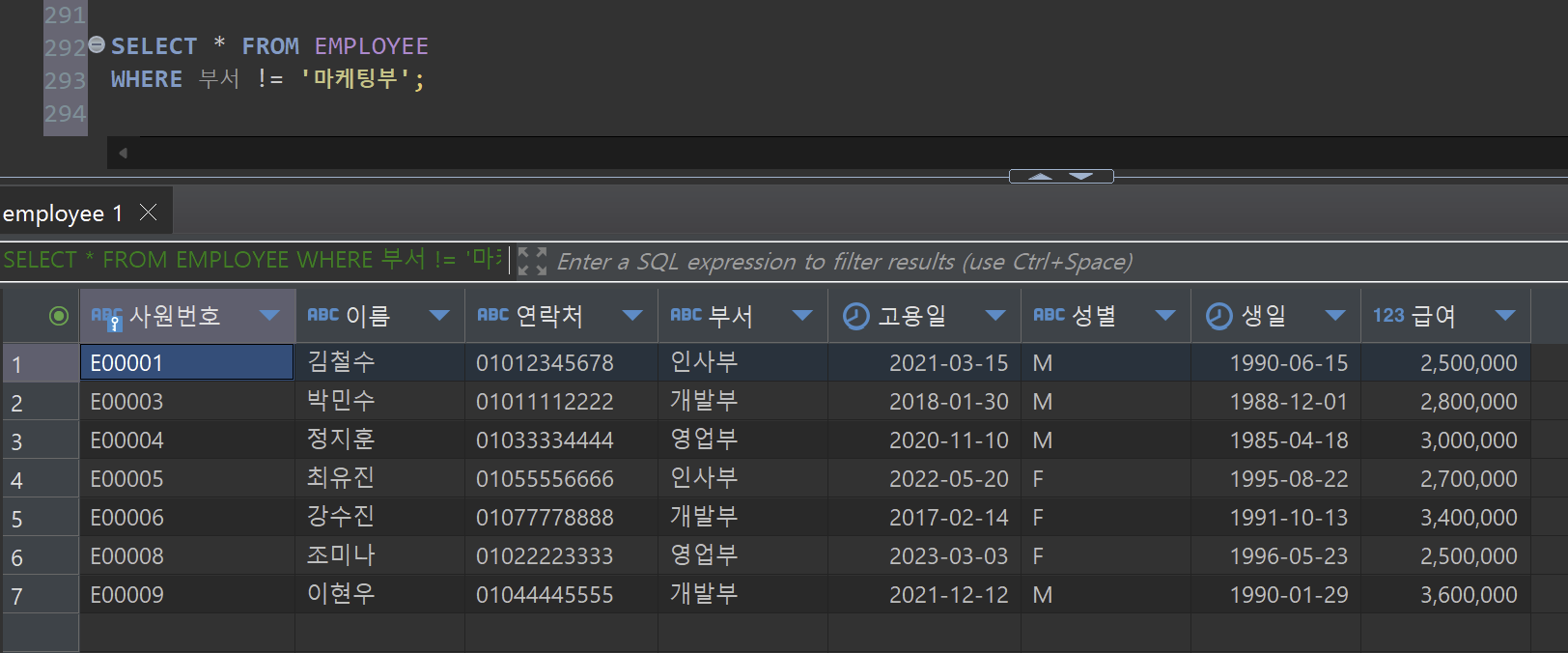 - AND: 두 조건 모두 참일 때만 행을 반환