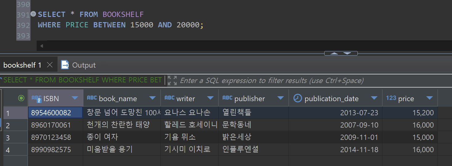 • BETWEEN 앞에 NOT을 붙여 해당 범위 내로 값을 가지지 않는 데이터를 조회하는 것도 가능하다.