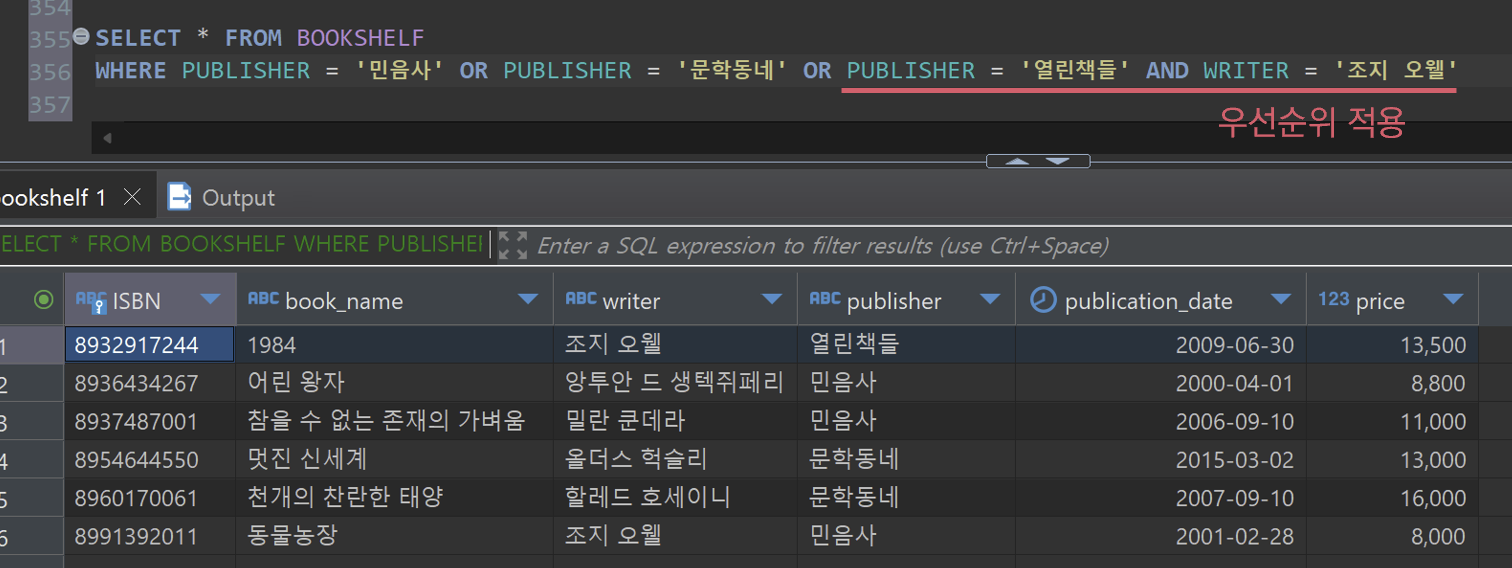 • AND 연산자가 OR 연산자보다 우선순위가 높아, AND 연산자가 OR 연산자보다 우선적으로 실행된다.