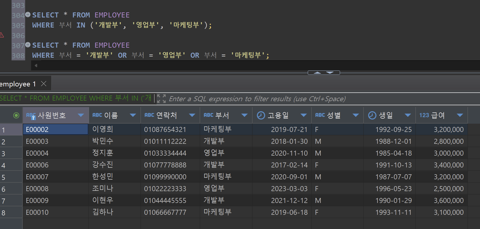 - OR: 두 조건 중 하나라도 참이면 행을 반환