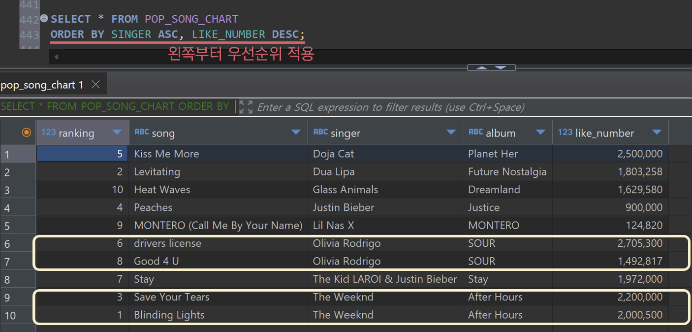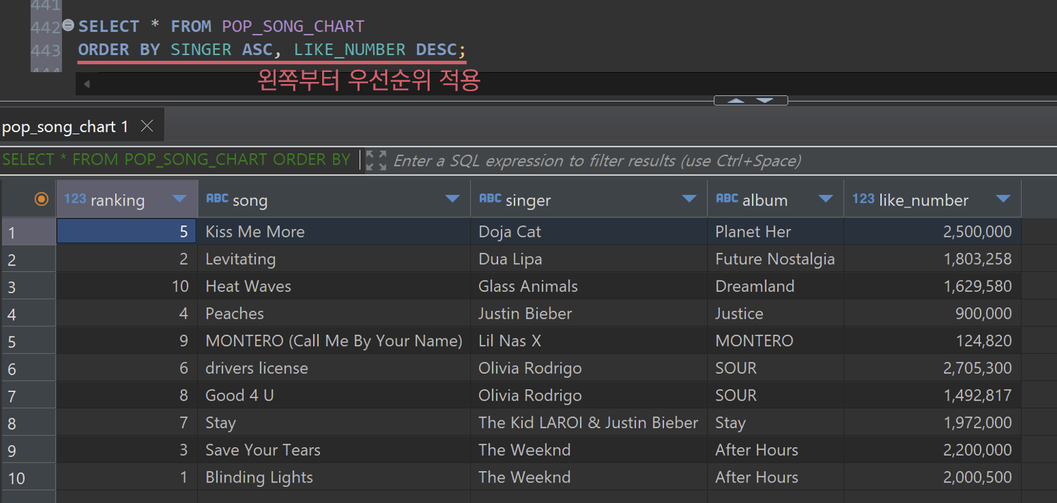 ➯ 가수에 따라 좋아요 수를 기준으로 정렬하고 싶다던가, 학년에 따라 이름을 정렬하고 싶다던가 등 세밀한 정렬은 여러 열을 기준으로 정렬해야 가능하다.