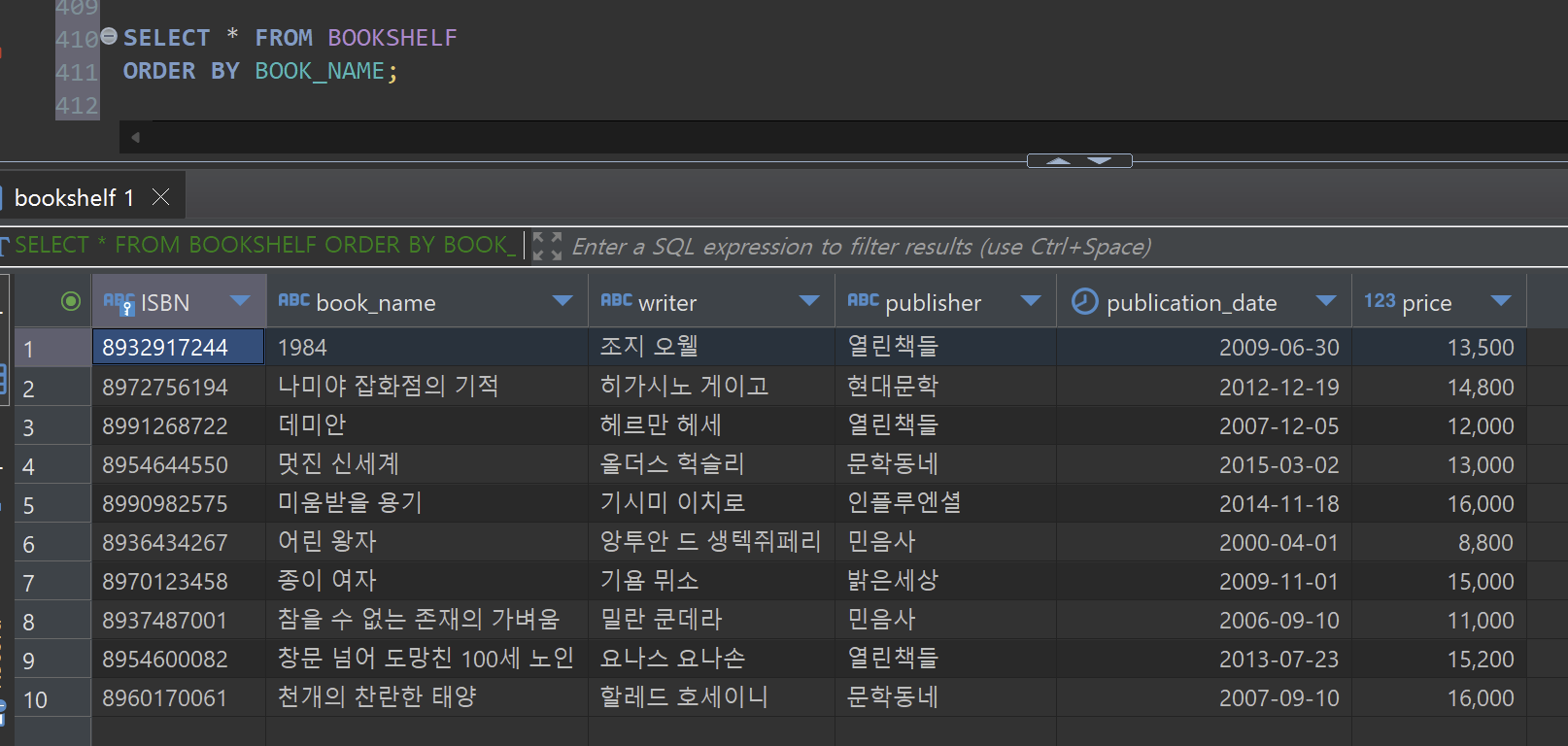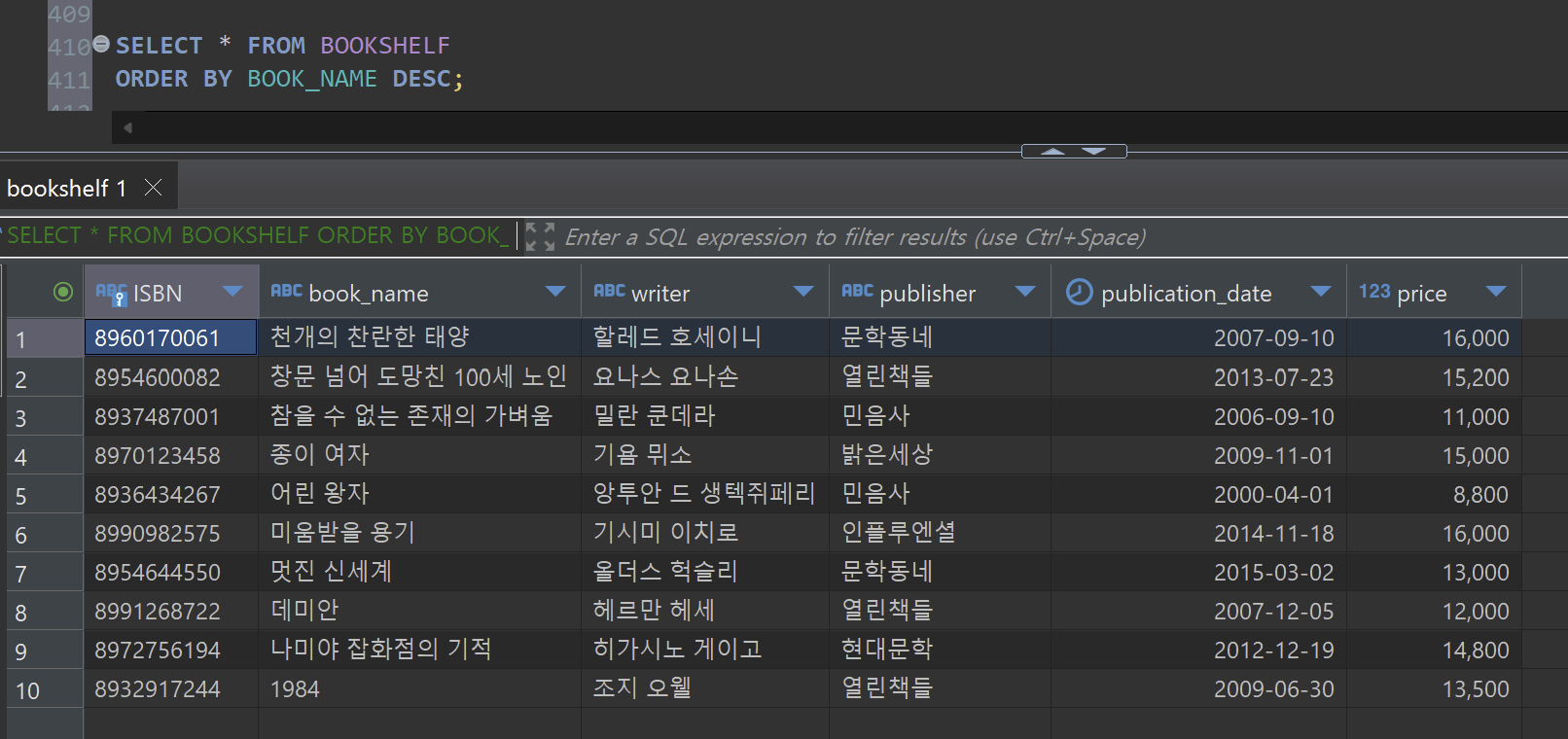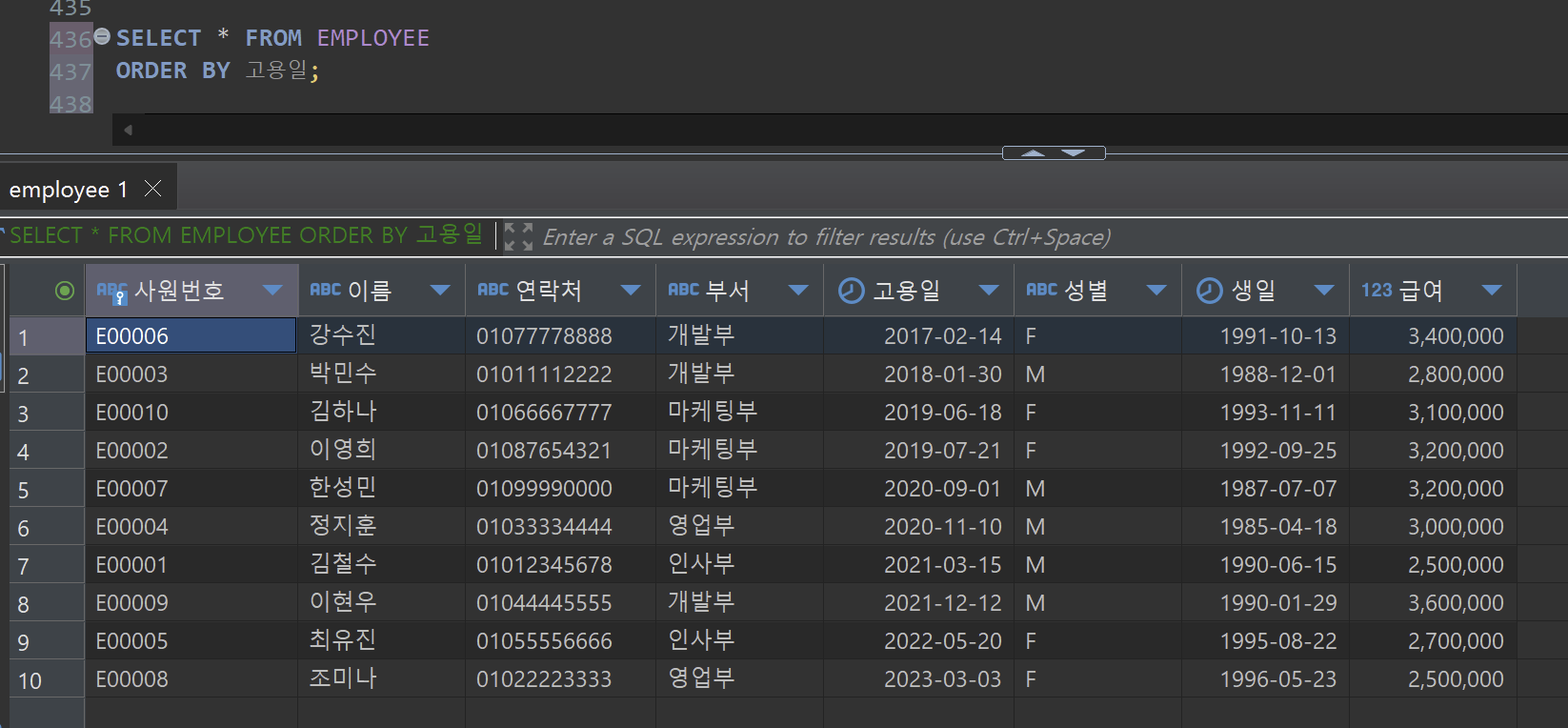 • 오름차순 정렬인 ASC은 기본값이라 생략이 가능하다.