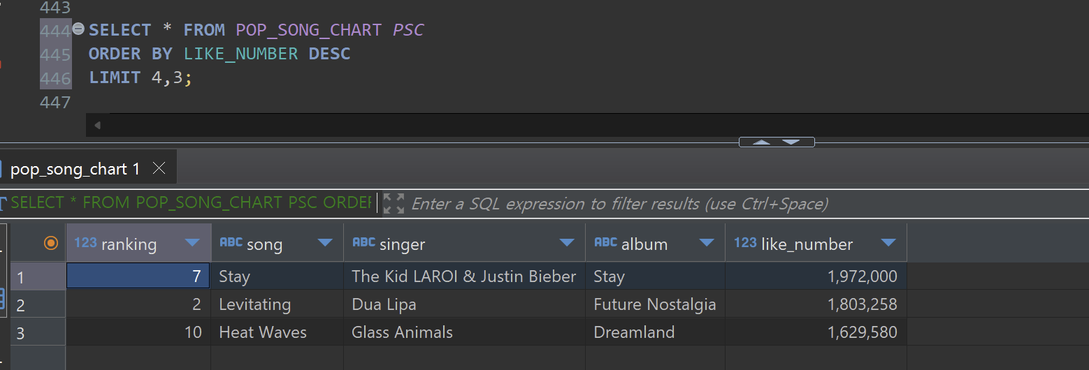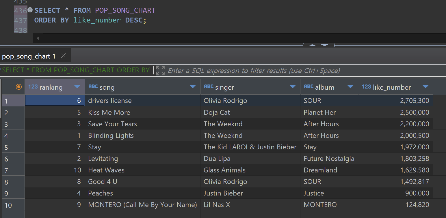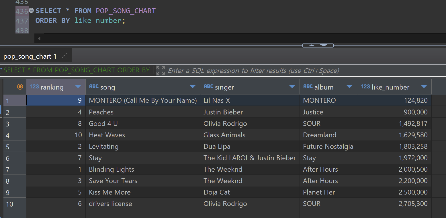 • 출력된 데이터를 보면, singer순으로는 정렬이 제대로 되어있지만, like_number의 경우 제대로 정렬이 되어있지 않는 모습을 확인할 수 있다.