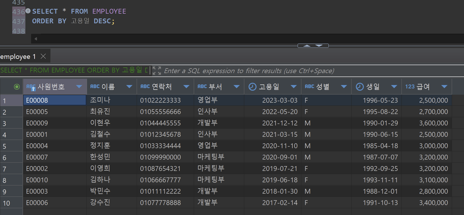 ※ 만일 ORDER BY가 GROUP BY나 WHERE보다 앞에 위치하면 에러가 나니 꼭 순서를 지키도록 한다.