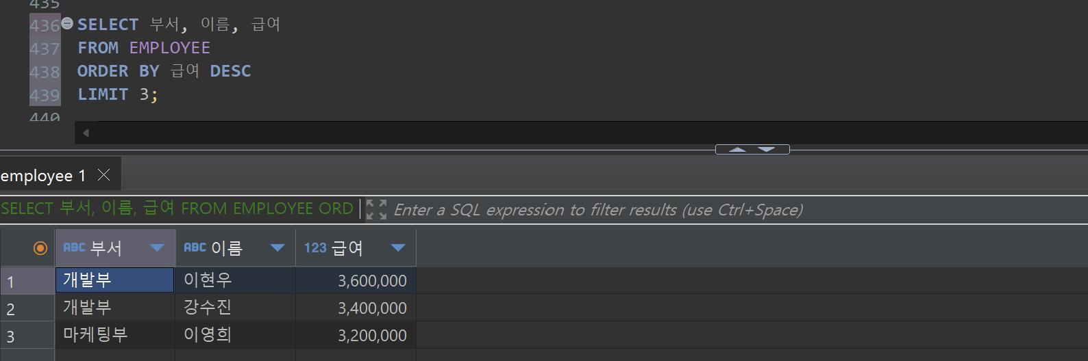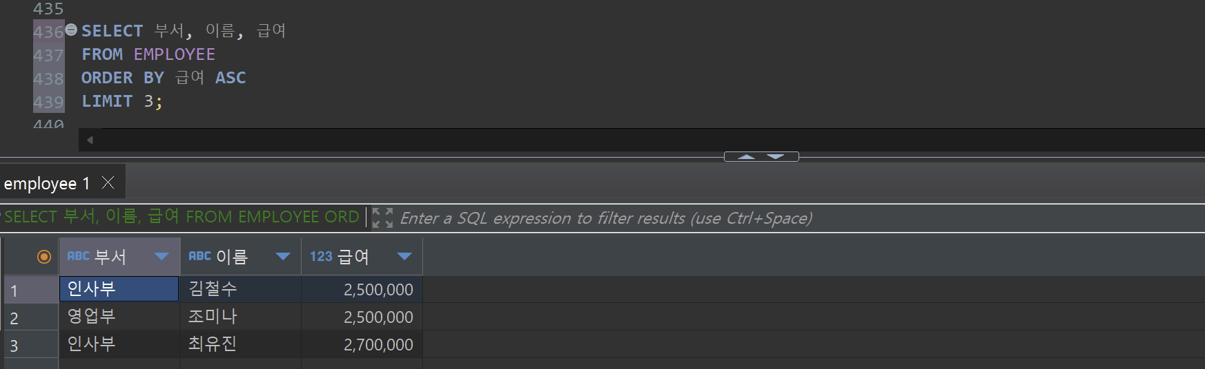 • 이 경우, 정렬이 완료된 결과에서 5번째 행부터 3개의 데이터를 반환하라는 뜻이다.