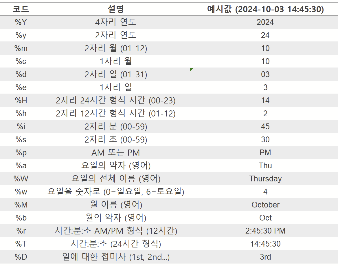 SELECT DATE_FORMAT(NOW(), '%W, %D %M %Y'); -- 결과: 'Thursday, 3rd October 2024'