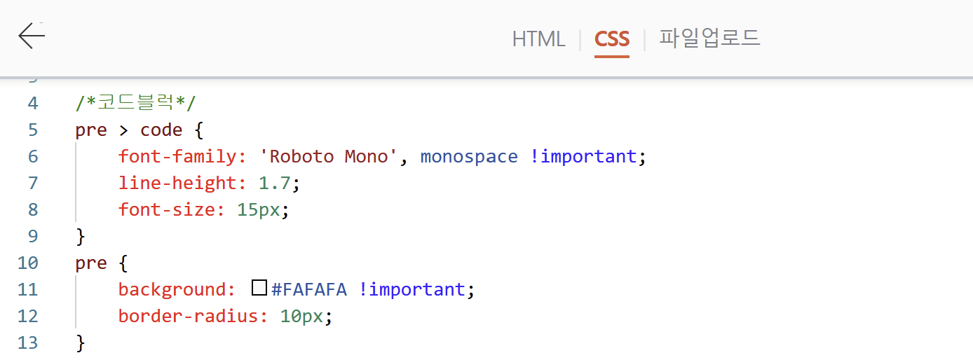 CSS 텝에서 pre > code 블럭안에 넣어주면 된다!