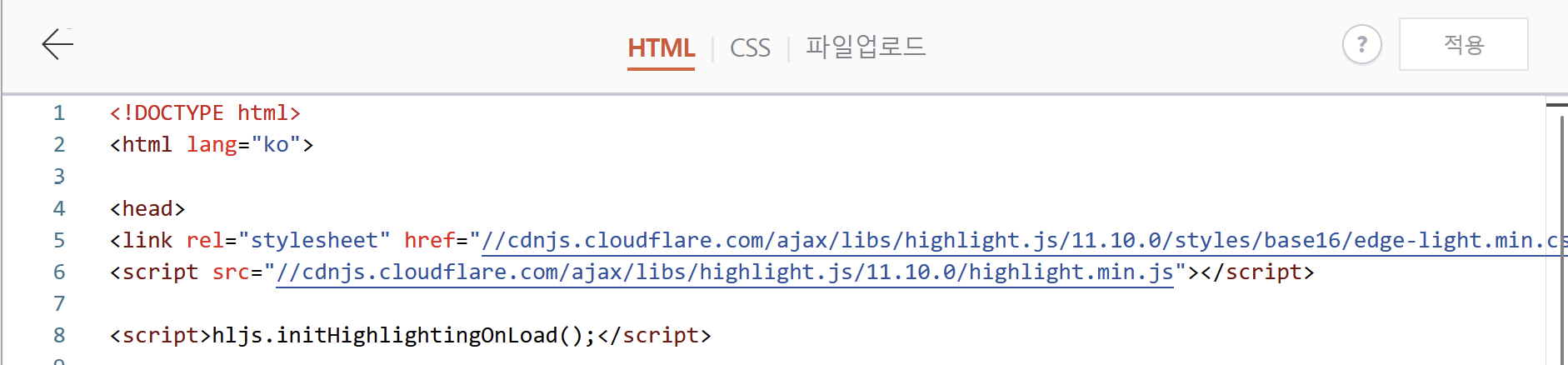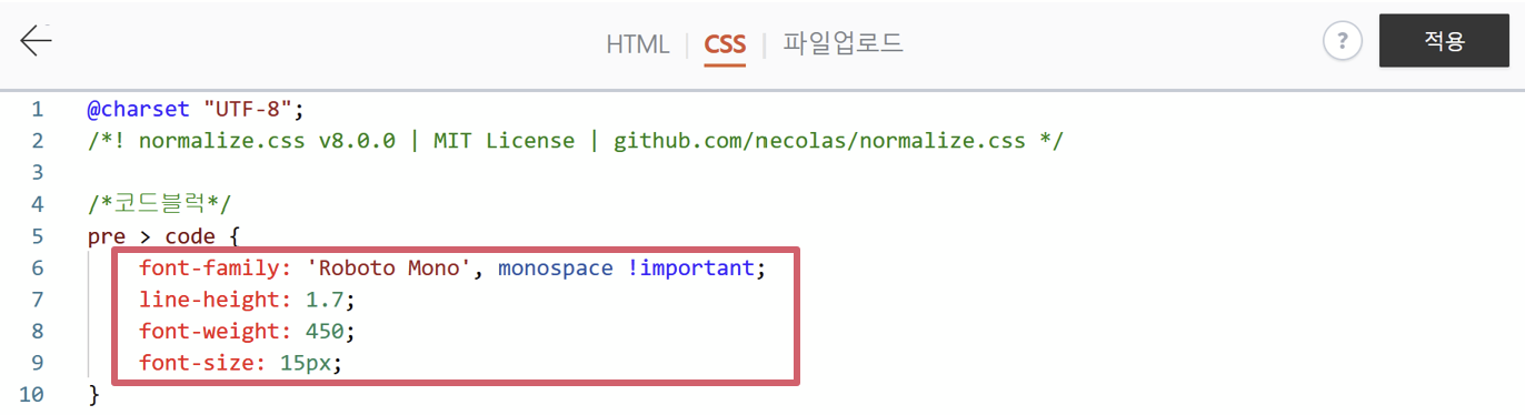 [html 편집]에서 CSS탭에 복사한 코드를 넣어준다.