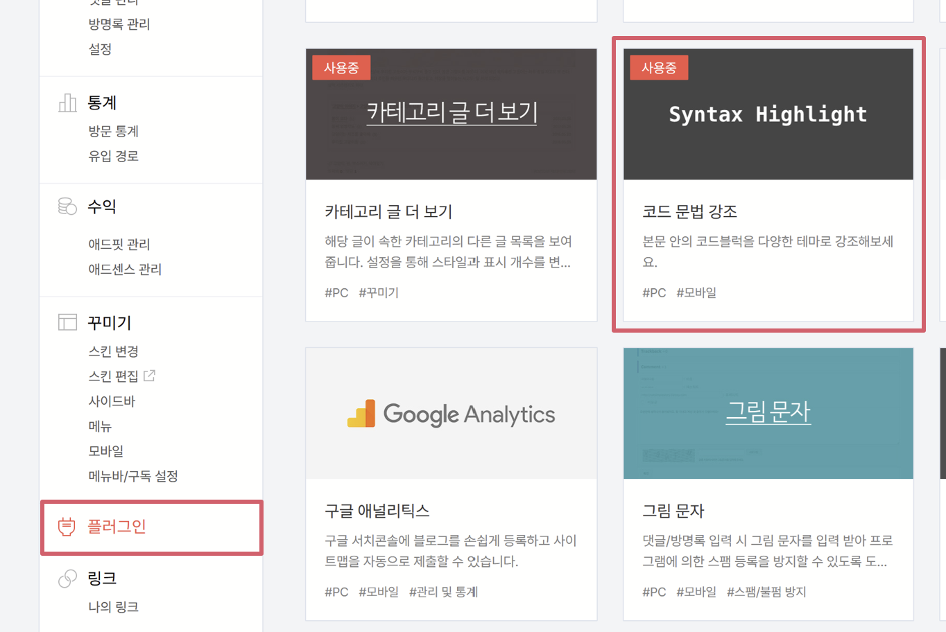 블로그 관리 페이지에서 플러그인 텝 → [코드 문법 강조]를 클릭한다.