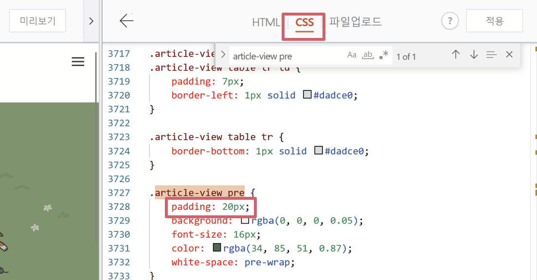 오른쪽 상단에서 CSS 옵션을 클릭 하고, Ctrl + F 키보드를 눌러 검색창을 띄운 후 'article-view pre' 를 입력한다.