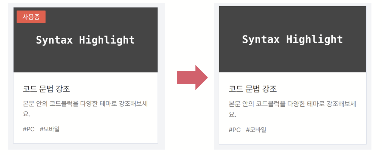 먼저 테마를 적용시키기 전에, 관리 페이지에서 [플러그인] 텝에서 코드 문법 강조를 사용 해제해주어야 한다.