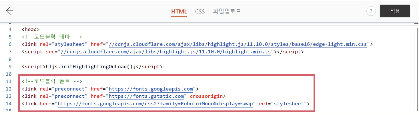 [스킨 편집] → [html 편집] → HTML탭에 마찬가지로 <head>와 </head> 내로 복사한 코드를 붙여준다.