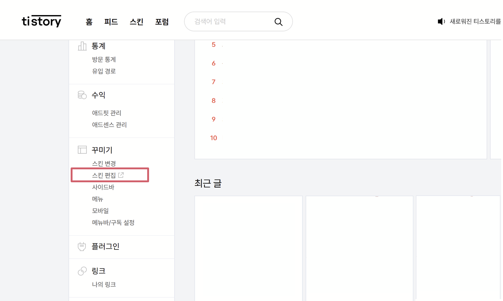 블로그 관리 페이지에서 꾸미기 텝 → [스킨 편집]을 클릭한다.