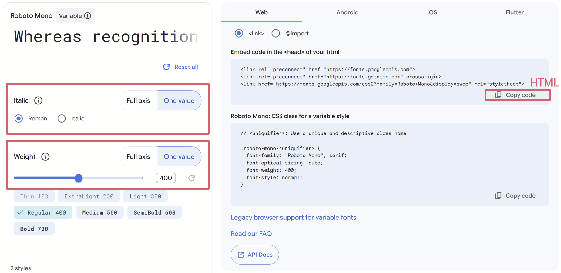 Italic으로 기울임과 Weight로 폰트의 굵기를 원하는 만큼 조정한 후에, 먼저 HTML에 붙일 코드를 복사해준다.
