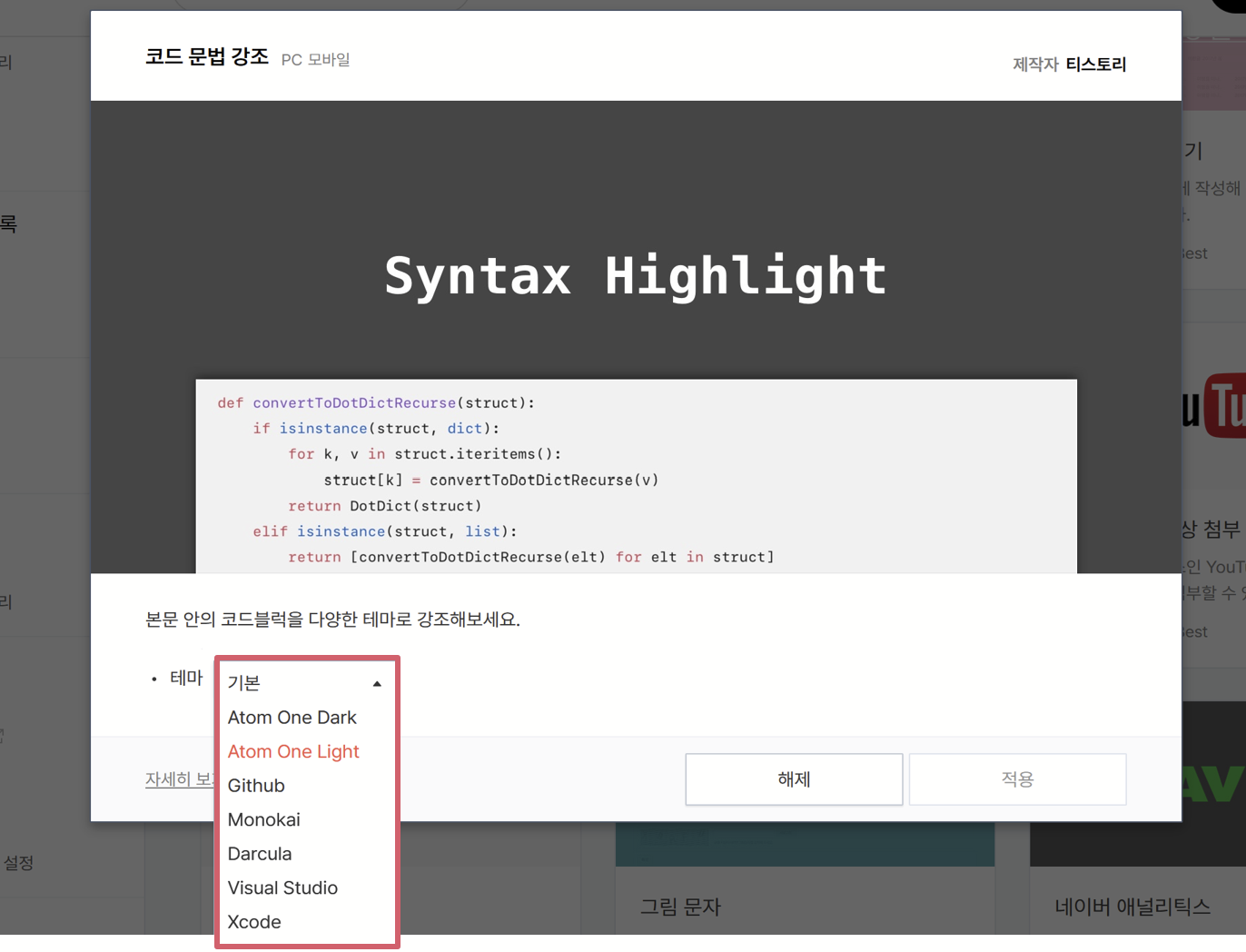 티스토리에서 기본으로 제공되는 여러 코드블럭 테마들이 존재하니 적용시켜보자.