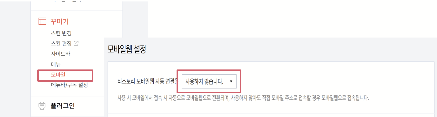 ※ 참고로 모바일에서도 바뀐 테마가 적용되게 할려먼 관리 페이지 [꾸미기] → [모바일] → 모바일웹 자동 연결을 '사용하지 않습니다'로 적용해야만 한다.