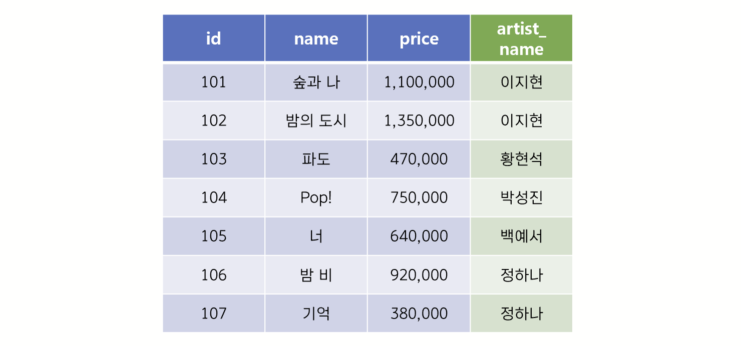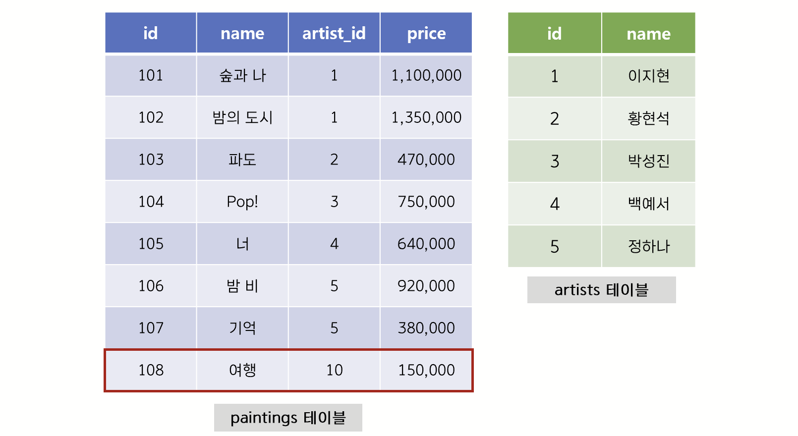 작가 정보와 작가가 그린 그림을 조회하는 이 SELECT문은 각 작품에 대해 해당 작품의 작가 이름을 반환해야 하는데, 그림을 두 개 이상 그린 작가들(이지현, 정하나)이 존재하기 때문에 작동할 수 없는 코드다.