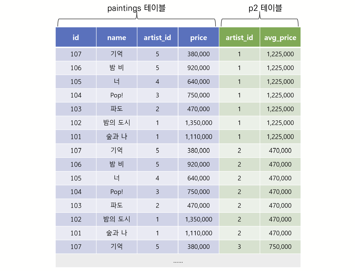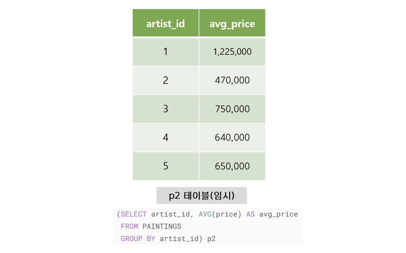 • FROM 절에는 paintings 테이블 p와 서브쿼리로부터 받은 임시 테이블 p2가 있다.