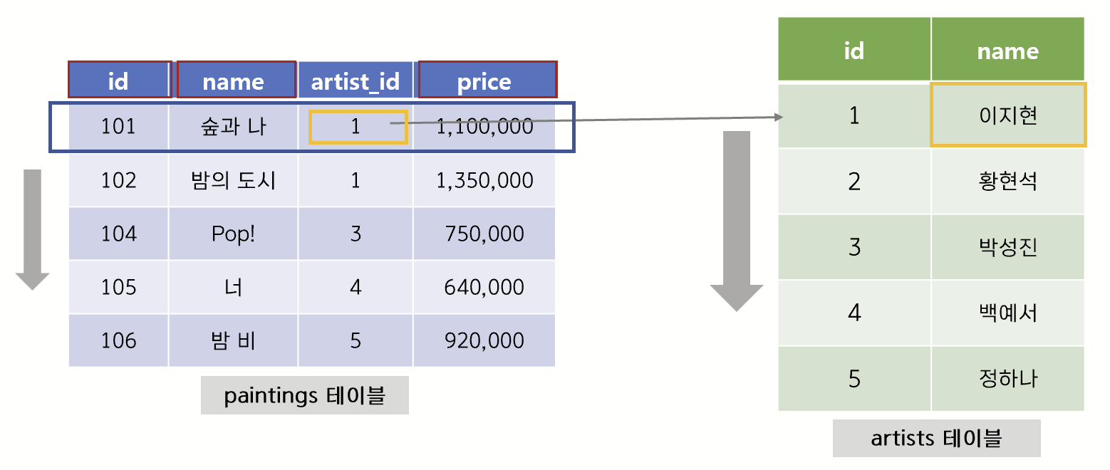 작품의 정보가 담긴 paintings 테이블과 작품의 작가에 대한 정보가 담겨있는 artists 테이블이 있다.