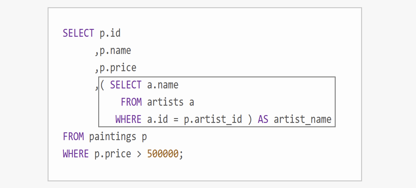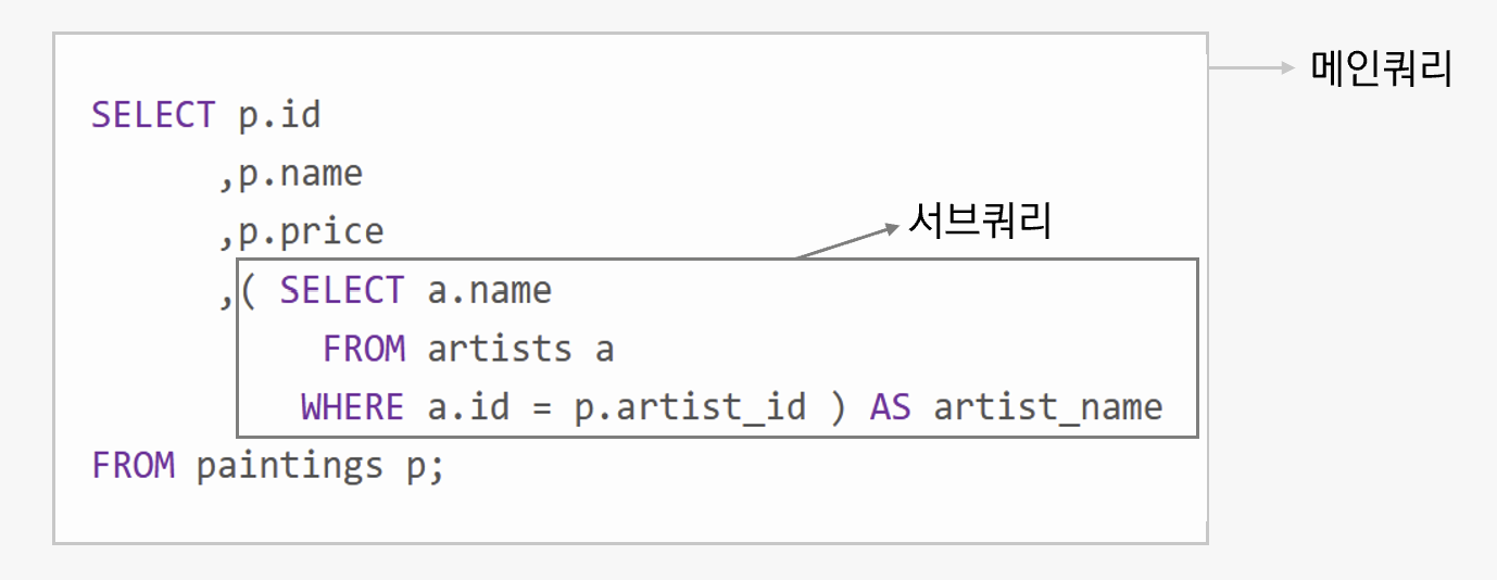 • 서브쿼리는 artists 테이블에서 a.id = p.artist_id 조건을 만족하는 행을 찾고, 해당 작가의 이름(a.name)을 반환