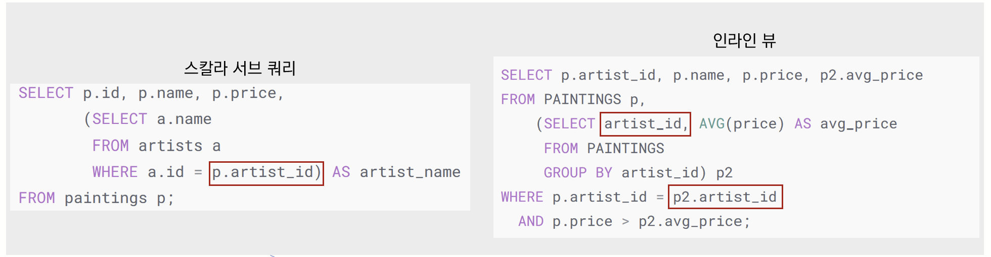 ➯ 반면, 인라인 뷰는 테이블 형태의 결과를 반환해야 하므로, 이 임시 테이블에는 메인쿼리에서 필요한 컬럼들이 포함되어야 한다. 인라인 뷰는 메인 쿼리가 실행되기 전에 먼저 실행되어 그 결과를 임시 테이블로 제공한다. 그 결과를 메인쿼리에서 조인하여 사용하게 되므로, JOIN 조건으로 사용할 컬럼들을 반드시 서브쿼리의 SELECT 절에 명시해야 한다. 예를 들어, 서브쿼리에서 만약 avg(price)만 SELECT 할 경우, 메인 쿼리가 받는 임시 테이블은 avg_price 컬럼 하나만 가지게 되어 artist_id와의 조인을 할 수 없으므로 에러가 발생하게 된다.