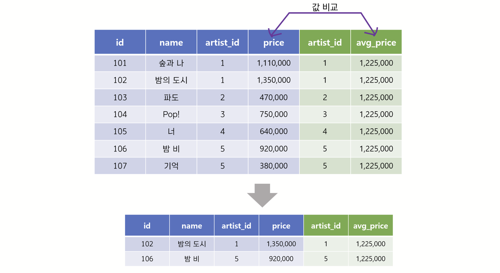 • 서브쿼리는 각 작가마다 평균 작품의 가격을 계산한다.