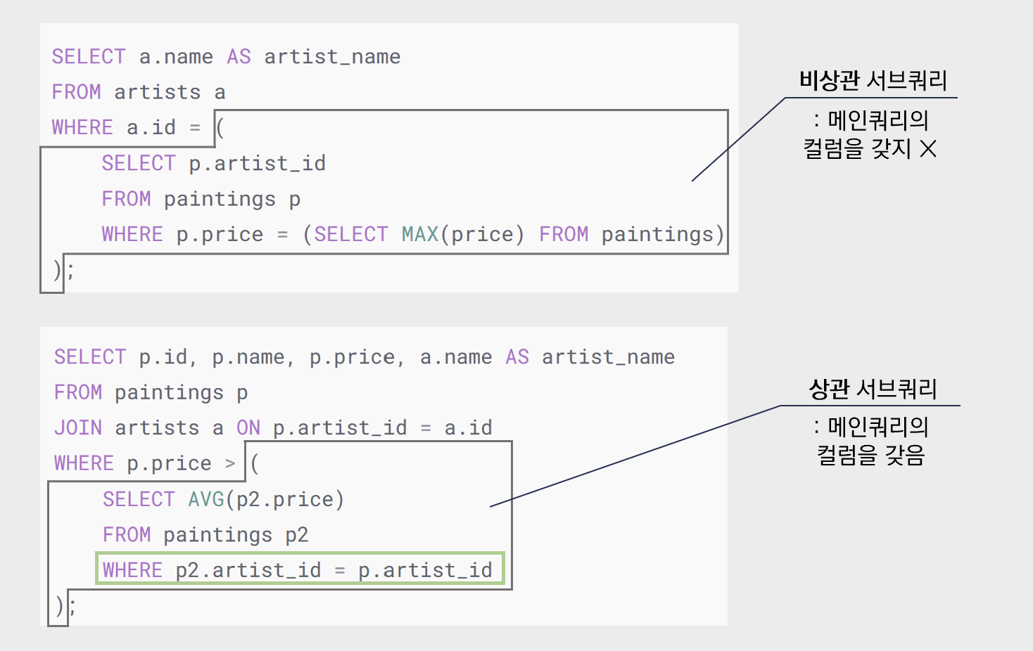 • 즉, 서브쿼리는 메인쿼리에서 참조된 값을 사용해 메인쿼리의 각 행에 대해 반복적으로 실행된다.
