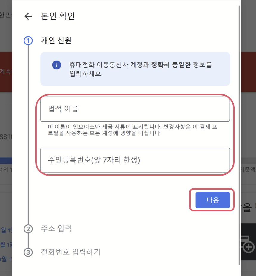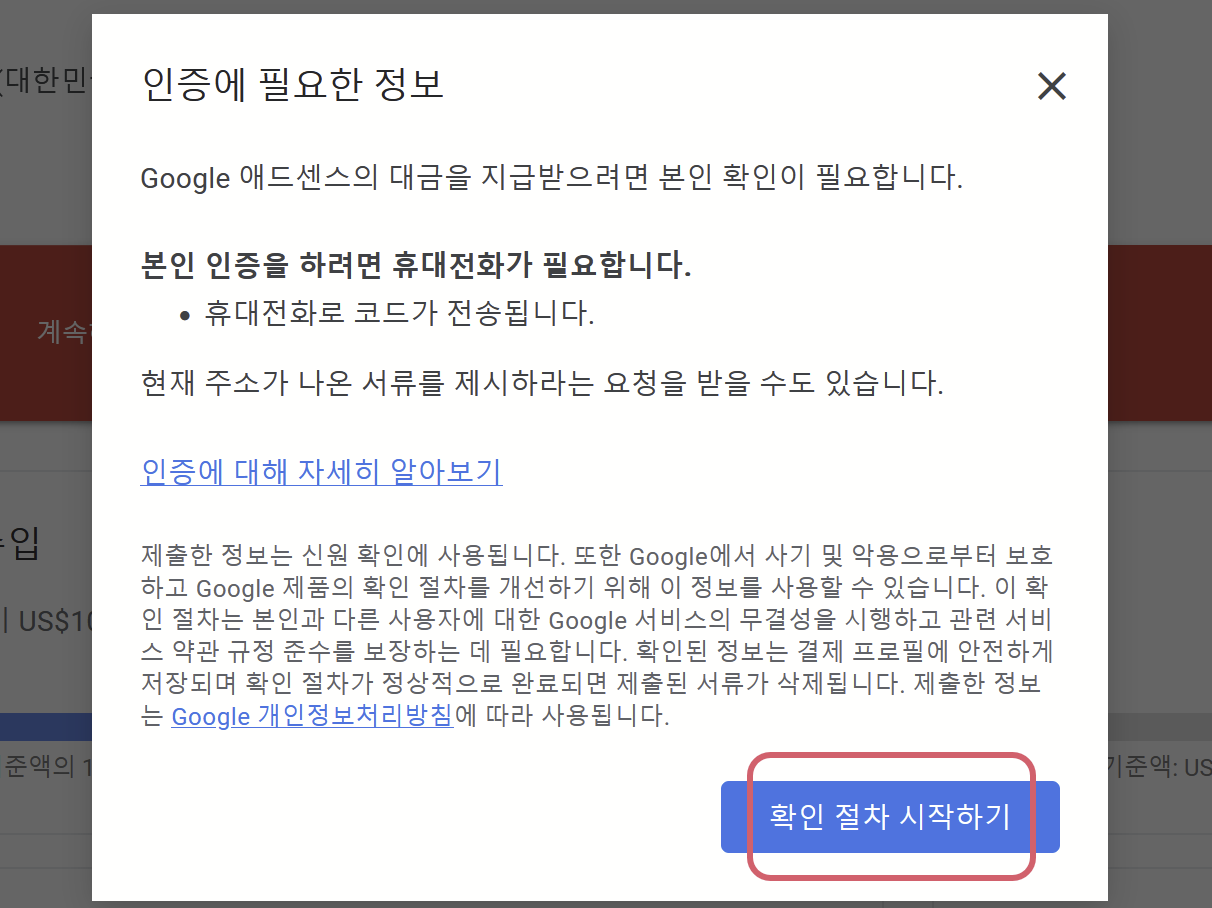 인증에 필요한 정보관련 창이 뜰텐데, '확인 절차 시작하기'를 클릭한다.