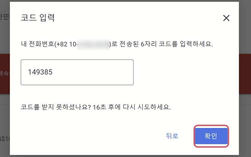 핸드폰으로 전송된 6자리의 인증 코드를 입력 후, '확인' 을 클릭한다.
