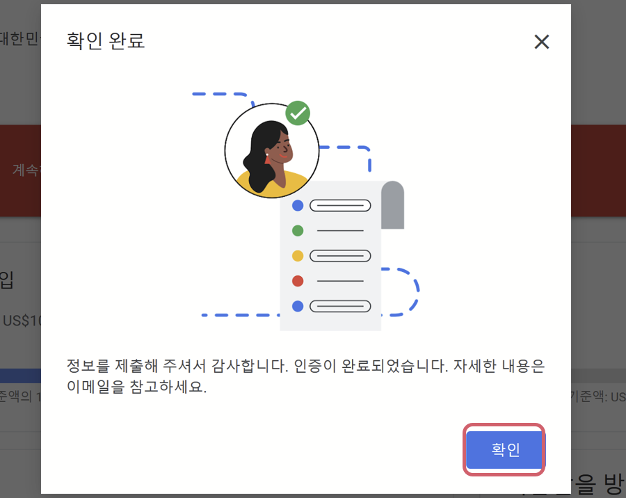 인증이 완료되었다는 창이 뜰텐데, 마지막으로 '확인'을 클릭해주면 된다.