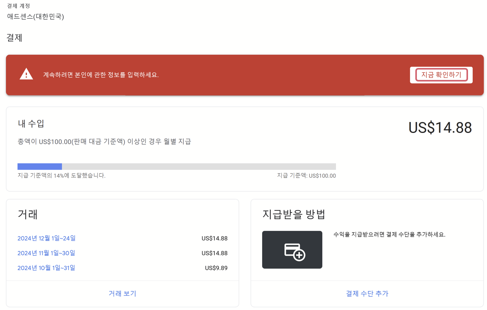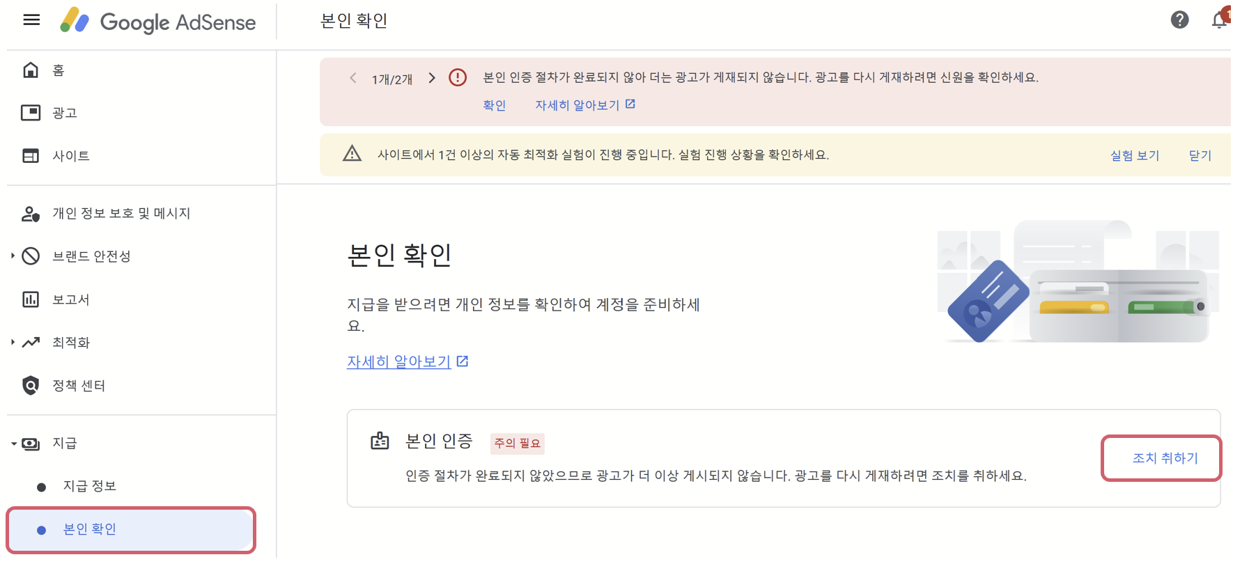 들어가보면 '본인 인증 절차가 완료되지 않아 더는 광고가 게재되지 않습니다'라는 경고 문구가 보인다.