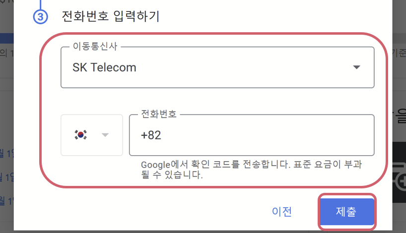 마지막으로 전화버호를 입력 후 '제출'을 클릭한다.