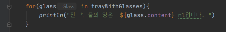 println("잔 '$i' 속 물의 양은 ${trayWithGlasses[i].content}ml입니다.")