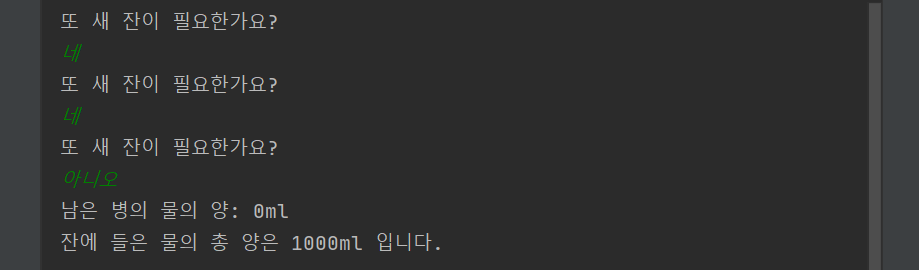 : 800ml 의 물이 들은 병을 새로 생성한 잔에 붓는다. 이 행동은 그 물의 양이 0 초과일때까지 반복된다. 즉, 병 내에 물의 양이 모두 없어지면, 그만둔다는 것.
