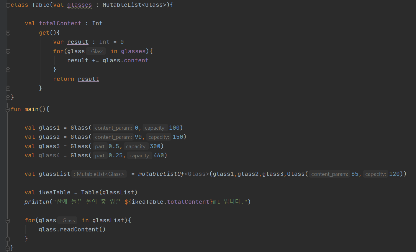 println("잔에 들은 물의 총 양은 ${ikeaTable.totalContent}ml 입니다.")