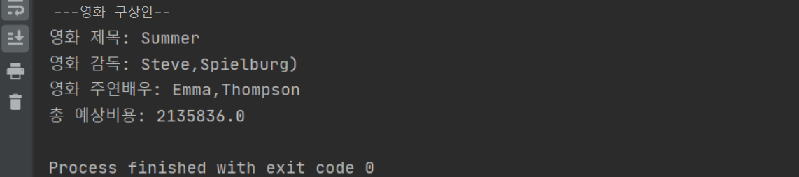 Actor와 Director 클래스가 만들어졌으니, 이제 가장 중요한 Movie 클래스를 만들어보자. 생성자에 director와 mainActor가 있는데, 이는 영화 오브젝트를 하나 생성할 시, 감독와 배우의 오브젝트가 필요하다는 뜻이다. 영화를 만드는데 드는 비용은 감독과 배우의 급여와 영화제작에 필요한 예산을 합한 걸로 했다. 수익은 읽기로만 참조할 수 있게 private 걸어두고 영화가 만들어졌을 때 그 값이 변경되어야 하니 var 가변변수로 했다.