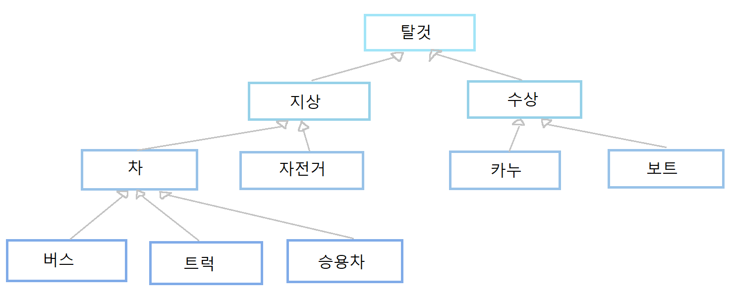 클래스 계층 구조는 단 하나의 층만이 아닌, 여러 층으로 확장할 수 있다. 클래스 계층 구조는 위로갈수록 일반화하고 아래쪽으로 갈수록 전문화한다고 생각하면 된다. 아래 그림 예시를 보자. 가장 상위의 클래스는 탈것이고 밑으로 계층이 내려갈수록 더 세분화되있음을 볼 수 있다. 여기서 중요한건, 상위클래스와 하위클래스가 " ~ 이다 관계 (is-relationship) " 로 묶여있다는 것이다. 밑에 예시로 얘기하자면, 지상탈것은 탈것이다. 차와 자전거는 지상탈것이다. 버스, 트럭과 승용차는 차다. 카누와 보트는 수상 탈것이다. 라는게 성립된다는 얘기다.