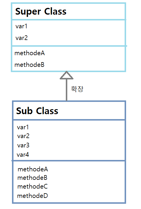 왼쪽 그림을 보자. Super Class 에는 var1,var2 이렇게 두개의 변수와 methodeA,methodeB 두개의 메서드를 가기고 있는 반면, Super Class 를 상속받은 Sub Class 는 Super Class 가 가지고 있던, 기존의 두 변수와 두 메서드 뿐만이 아니라, 새로운 속성과 메서드를 가지고 있는 걸 볼 수 있다. 이미 존재하는 클래스를 확장한 것이다.