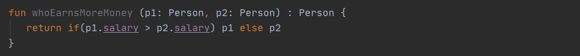 메서드 whoEarnsMoreMoney는 Person 타입을 파라메터로 받고 두 객체의 급여를 비교 후 더 큰 큽여를 가진 객체 (Person타입)을 반환한다.