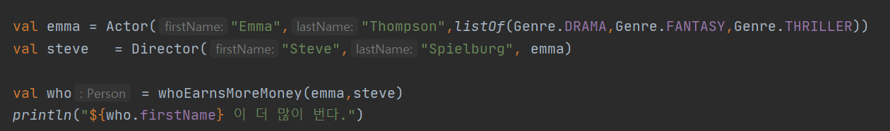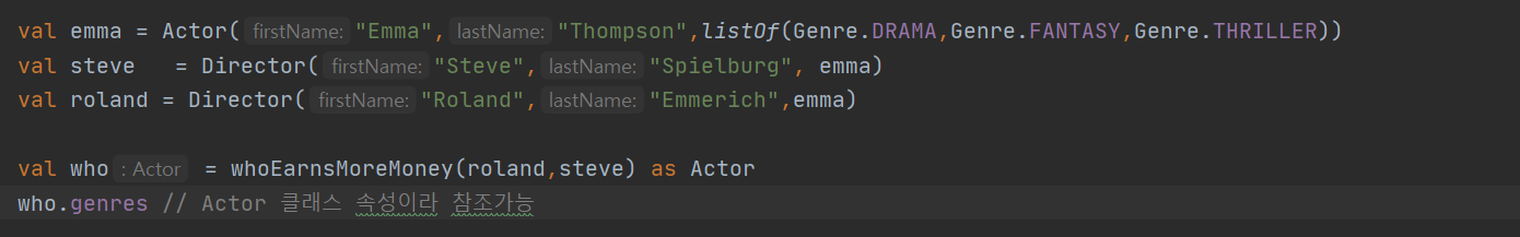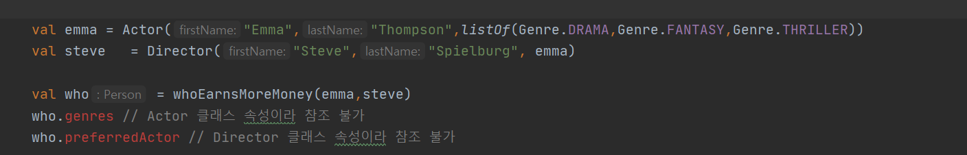 who는 whoEarnsMoreMoney 메서드의 반환값이니 Person타입을 가지고 있을 것이다. Person 타입으로 반환하는 메서드이기에 Actor도 Director 타입도 메서드에 사용이가능해 범용성이 넓지만 단점이 있다. Person 타입인 만큼 Actor나 Director 타입만이 추가로 가지고 있는 속성이나 메서드 참조가 불가능하다는 것이다. (밑에 사진 참조)