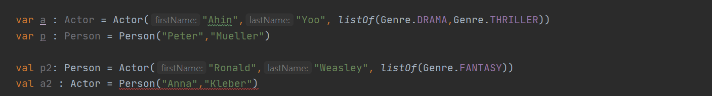 a와 p는 당연히 문제될 게 전혀 없다. 반면에 좀 살펴봐야 할 부분은 p2와 a2 다. p2는 Actor 타입이 상위 타입인 Person 타입의 모든 작업들이 허용 가능하니 문제되지 않는다 [모든 영화배우는 사람이다]. a2는 Person 타입이 하위타입(더 전문화된)인 Actor의 모든 작업들이 실행 가능하지 않으므로 프로그래밍 실행 전 이미 컴파일러 에러가 뜬다 [모든 사람은 영화배우가 아니다].