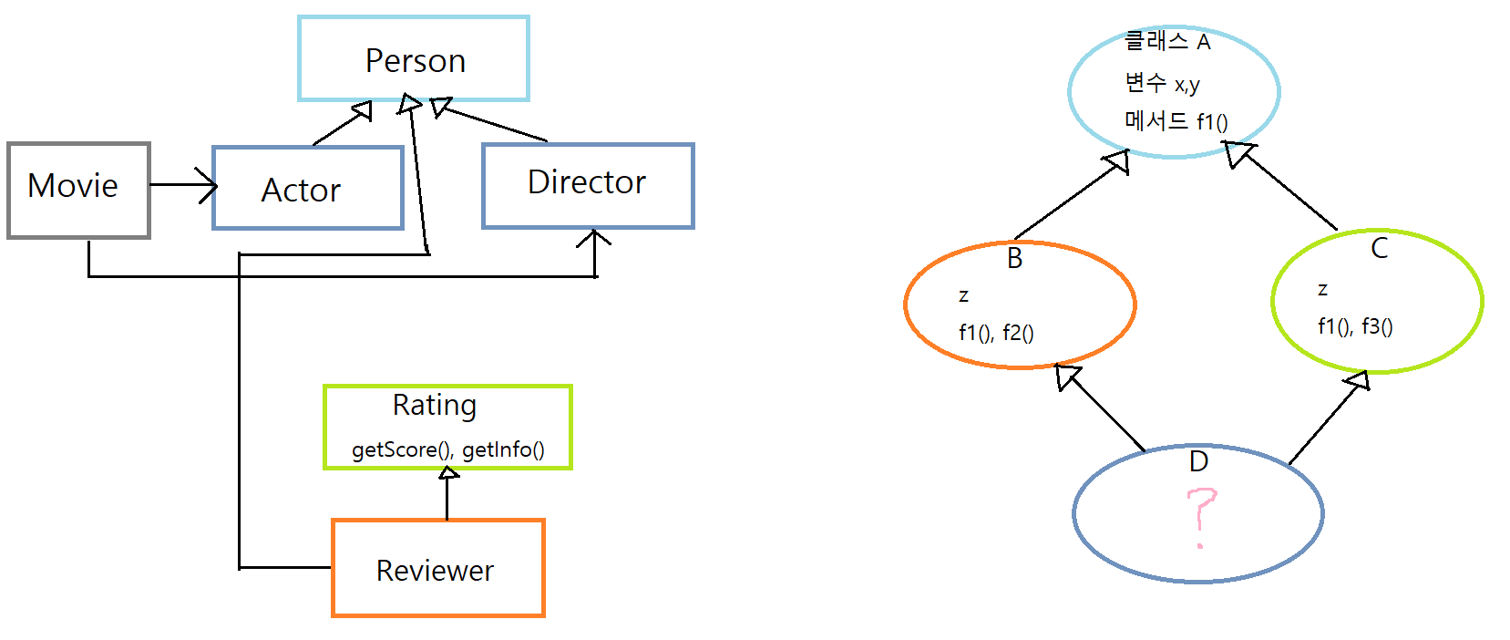 왼쪽과 같은 구조를 생각했다고 가정해보자. 그러면 Reviewer 클래스는 두개의 클래스를 상속해야 한다. 그렇다면 여기서 두개의 상속을 받은 하위클래스에선 무슨일이 일어나게 될까? 오른쪽과 같은 클래스 구조가 갖춰져있다고 생각해보자. variable1 : A = D() , variable1.f1() 을 써 메서드 f1()을 호출한다면 D는 클래스 B의 f1()을 가져오게 될까, 아니면 클래스 C의 f1()을 가져오게 되는 걸까? 문제가 생겨버린다. 변수도 마찬가지다. 클래스 B와 C에 같은 이름을 가진 변수가 있다고 쳐보자. variable2 : D = D(), 여기서 d.z = 45 라 가정했을시 이 z는 어느 클래스에서 온 건지 알수가 없다. 이런 등등 여러 문제가 발생해서 그럴까? 코틀린에선 클래스가 단 하나의 상위 클래스로부터만 상속받을 수가 있다.( 자바도 그랬던걸로 기억하는게 기억이..)