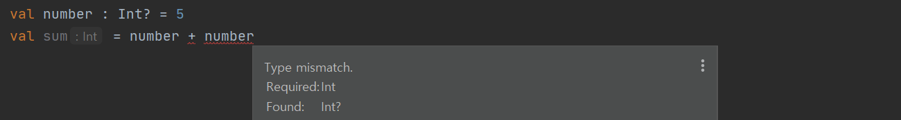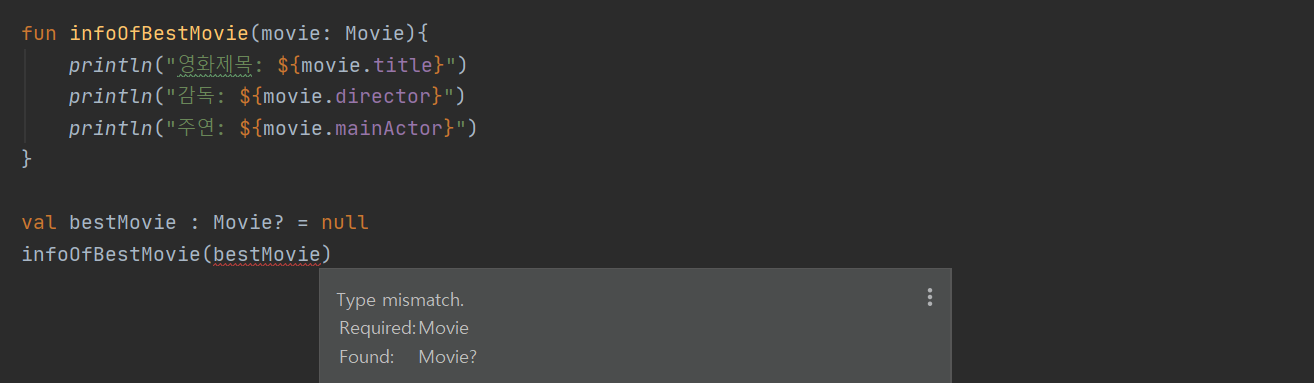 infoOfBestMovie 는 Movie 타입을 파라매터로 받아 실행되는 함수다. 여기에 Movie? 타입을 가진 bestMovie는 파라매터로 집어넣기가 불가능하다. 사진에 Type mismatch 에러가 뜬 걸 볼 수 있다.