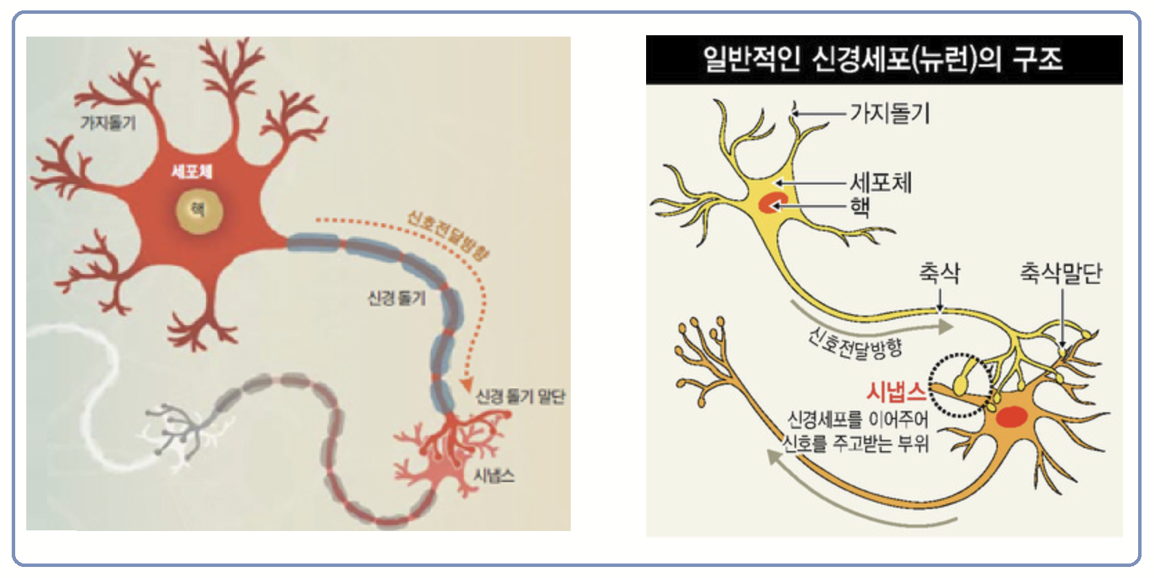 주름진 사람의 뇌에는 '뉴런(Neuron)'이라 하는 대략 1000억개의 신경세포가 존재한다. 타체세포와 달리 신경세포에는 수많은 가지(축삭과 가지돌기)들이 뻗어나와 서로 연결되어 있는데, 이 가지와 가지를 이어 신호를 주고받는 부위가 '시냅스(Synapse)'다. 시냅스에서는 전압이 일정 이상이 될 시, 신경 전달 물질을 분비하고 이것이 다음 신경세포에 전달되어 전기신호가 전해진다. 따라서 인간의 뇌는 전기회로와도 같아 인간의 지능이 컴퓨터로 실현되는게 가능하다.